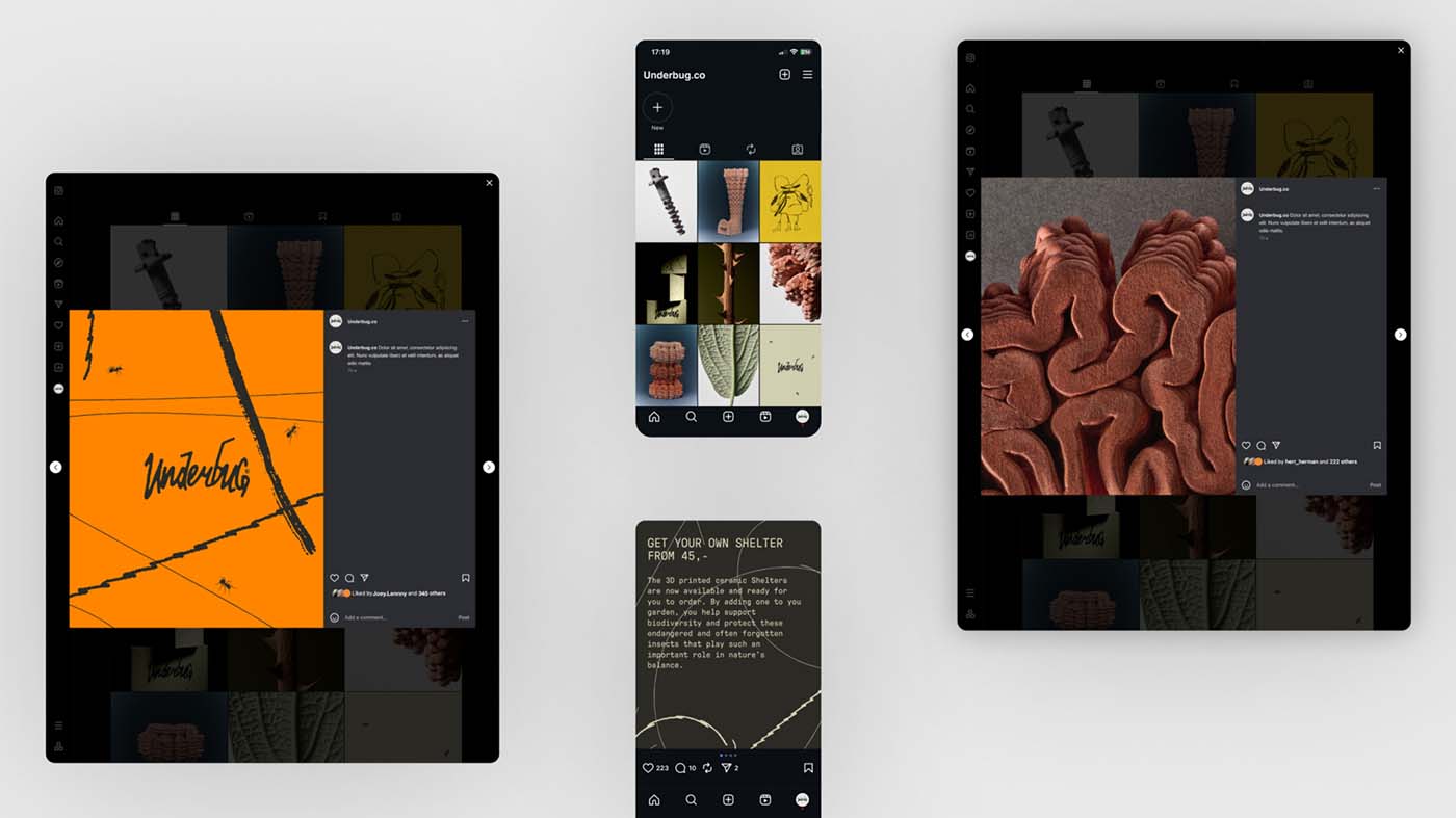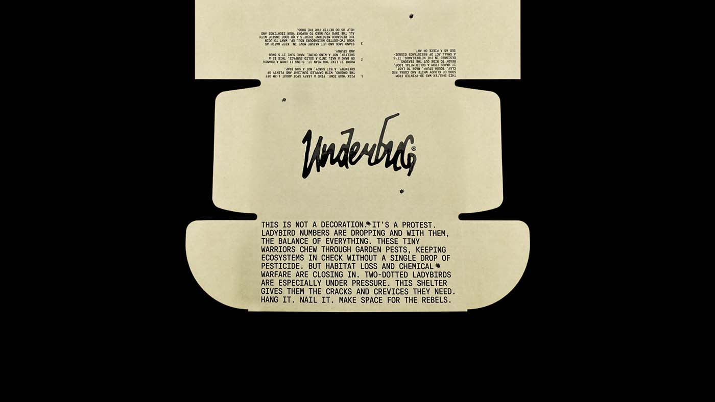 Underbug is a Dutch designer creating 3D-printed clay habitats for insects, designed to hang in urban gardens and encourage biodiversity. Inspired by punk and zine aesthetics, the brand identity expands into packaging and a small zine, focusing on often overlooked species like lacewings, ladybugs and dragonflies.